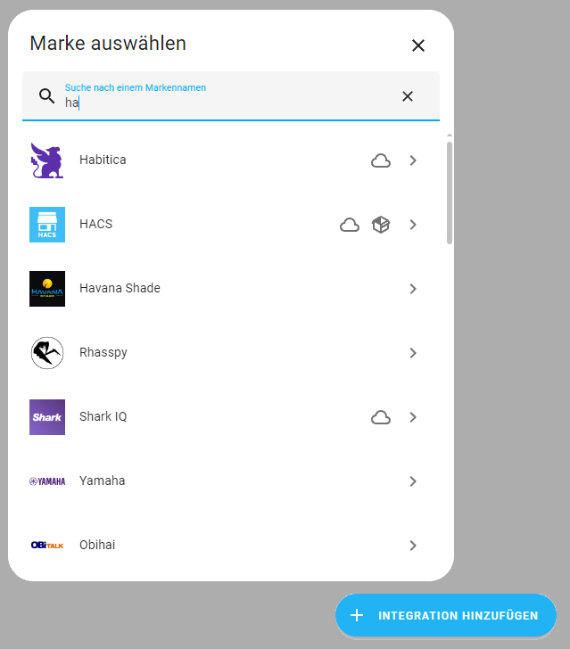 Über den Button "INTEGRATION HINZUFÜGEN" untern rechts wird der Dialog zum Hinzufügen einer Integration geöffnet. Mit Hilfe der Suchleiste wird nach der HACS Integration gesucht und diese ausgewählt: