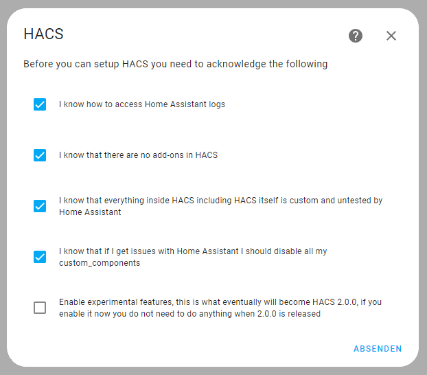 Nur noch die letzte Meldung im Home Assistant bestätigen und der HACS ist einsatzbereite und wird in der Seitenleiste angezeigt.