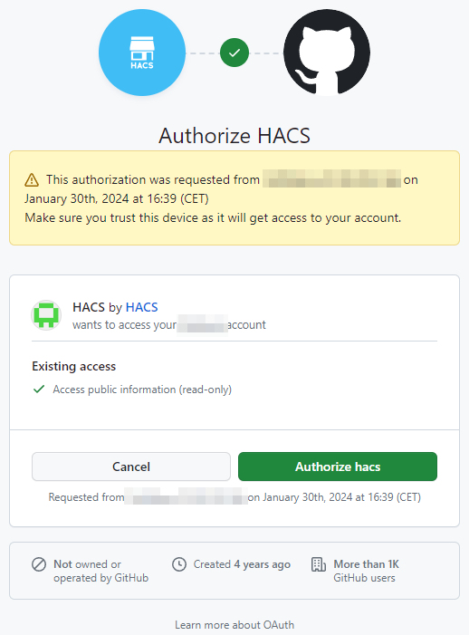Und schließlich der Zugriff von HACS auf Github genehmigt werden: