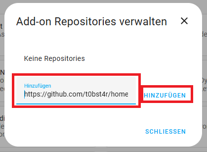 Im neuen Fenster das Repository "https://github.com/t0bst4r/home-assistant-addons" eintragen und "HINZUFÜGEN" auswählen: