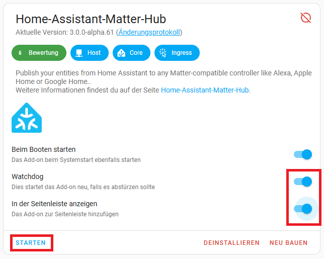 Die Optionen "Watchdog" und "In der Seitenleiste anzeigen" aktivieren und den "Home-Assistant-Matter-Hub" starten:
