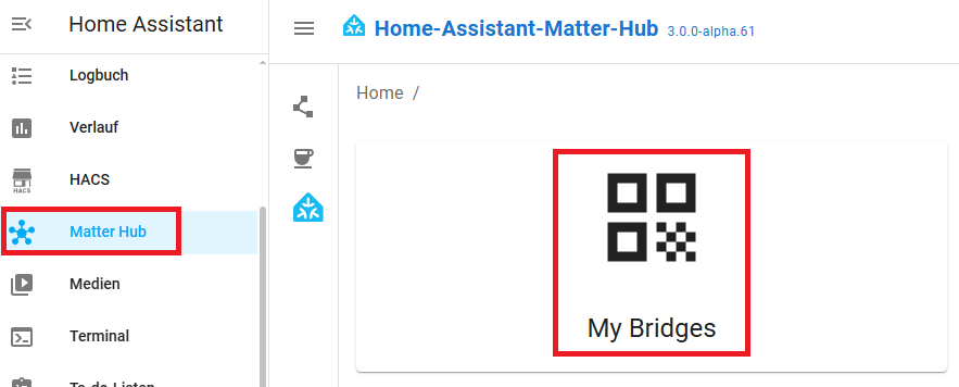 Im Seitenmenü "Matter Hub" auswählen und die Kachel "My Bridges" auswählen: