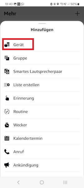 Auf dem Smartphone die Alexa App öffnen und den "+" Button auswählen: