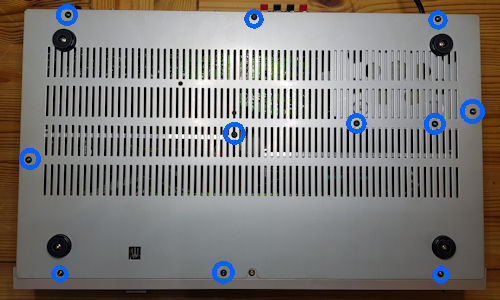 Um die Bodenplatte abnehmen zu können müssen die 11 schwarzen Schrauben (blau markiert) entfernt werden.