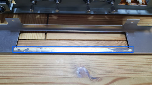 Das Skalen-Glas ist im Rahmen nur eingesteckt. Unterhalb den Spulen ist es jedoch mit zwei Stücken Klebestreifen befestigt (blau markiert). Dies müssen entfernt werden, dann kann das Glas vorsichtig abgenommen werden.