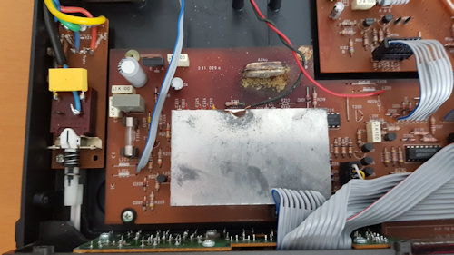 Leider beginnt die ausgelaufene Flüssigkeit im Dunklen mit ihrer Zerstörungsarbeit. Ich hatte Glück, dass bei meinem Gerät wenig Flüssigkeit durch die Lötpunkte nach unten durchgesickert ist, sondern das meiste oben an den Rand der Platine lief und sich dort verteilte. Dadurch waren die Leiterbahnen zwar angegriffen aber nicht zerstört.